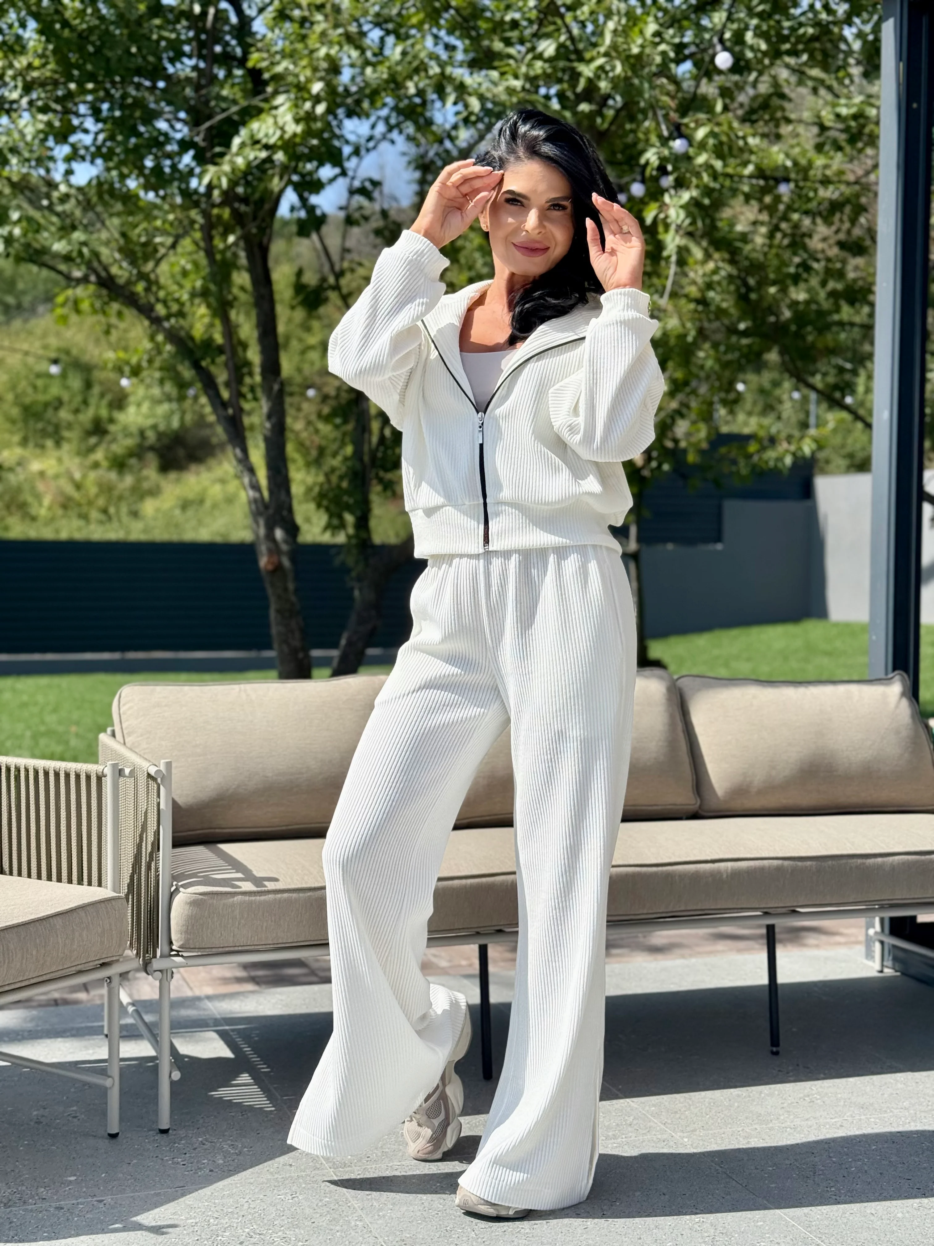 Set modern și versatil din catifea reiată moale și plăcută la atingere. Bluza are croi lejer, tip hanorac cu fermoar, glugă practică și buzunare laterale, completată de pantaloni cu talie elastică și croi drept, ușor evazat, care alungește silueta și oferă confort la purtare. Un ansamblu comod și stylish, ideal pentru zilele în care vrei să îmbini confortul cu un look modern – poate fi purtat cu sneakers pentru un stil casual sau cu bocanci/botine pentru un outfit urban de toamnă.